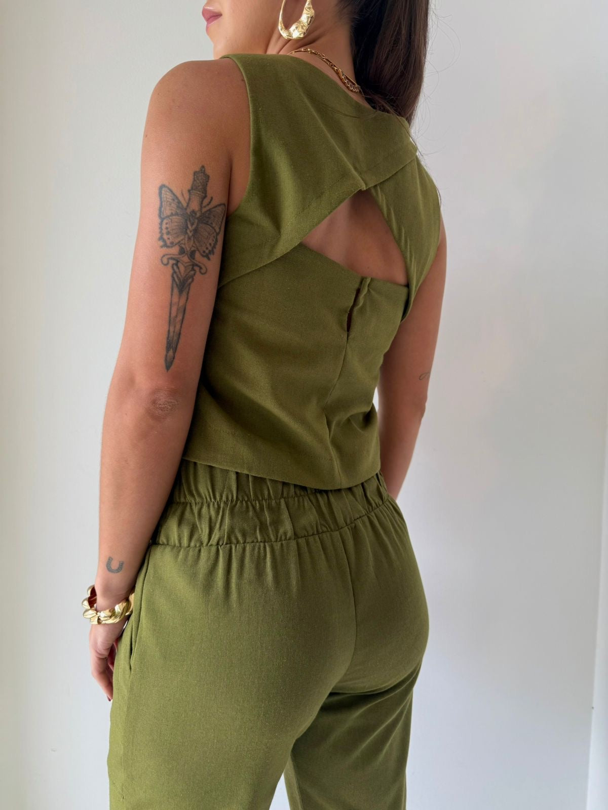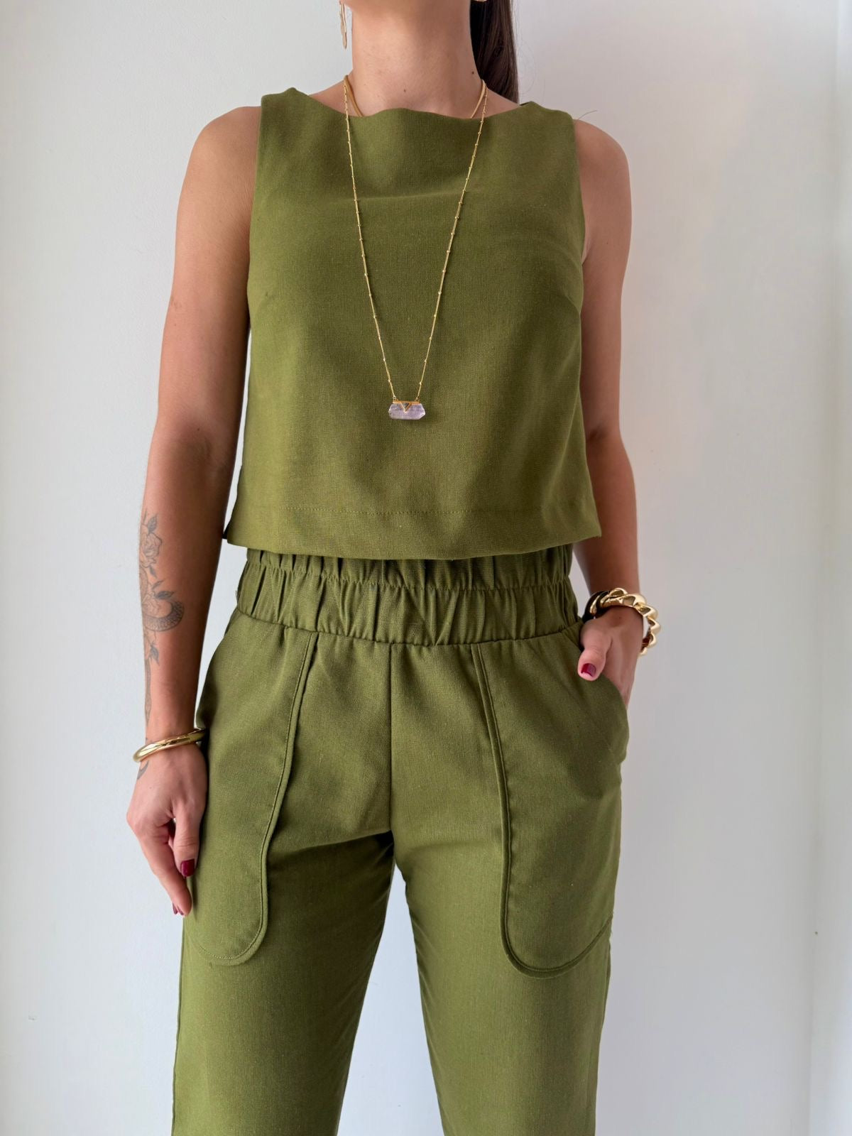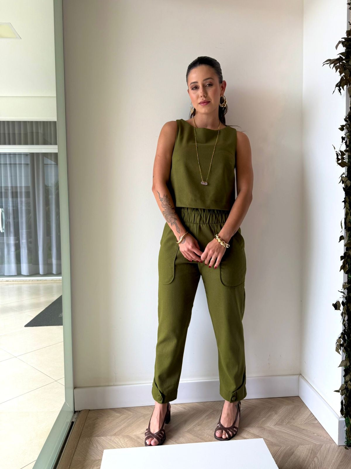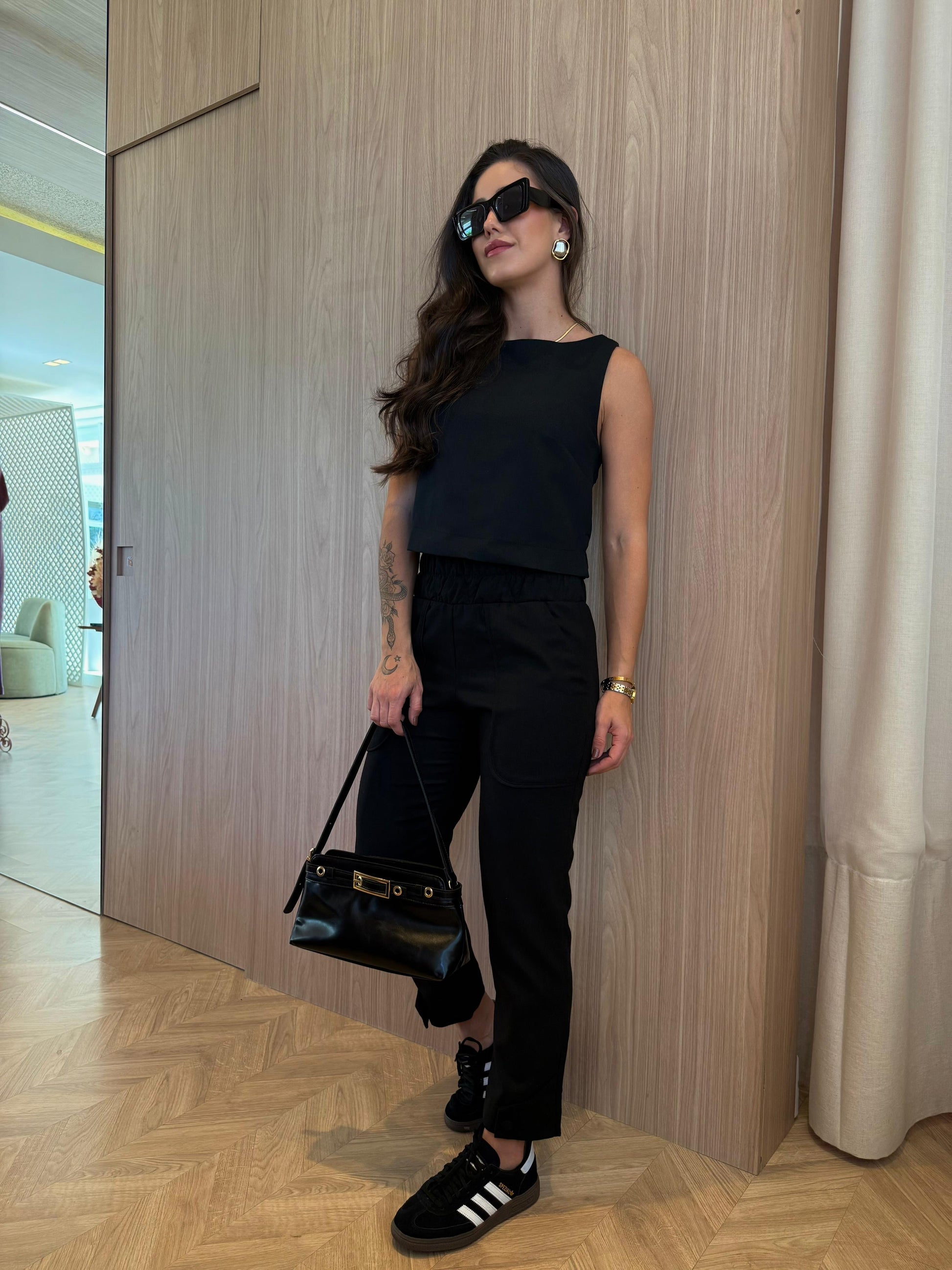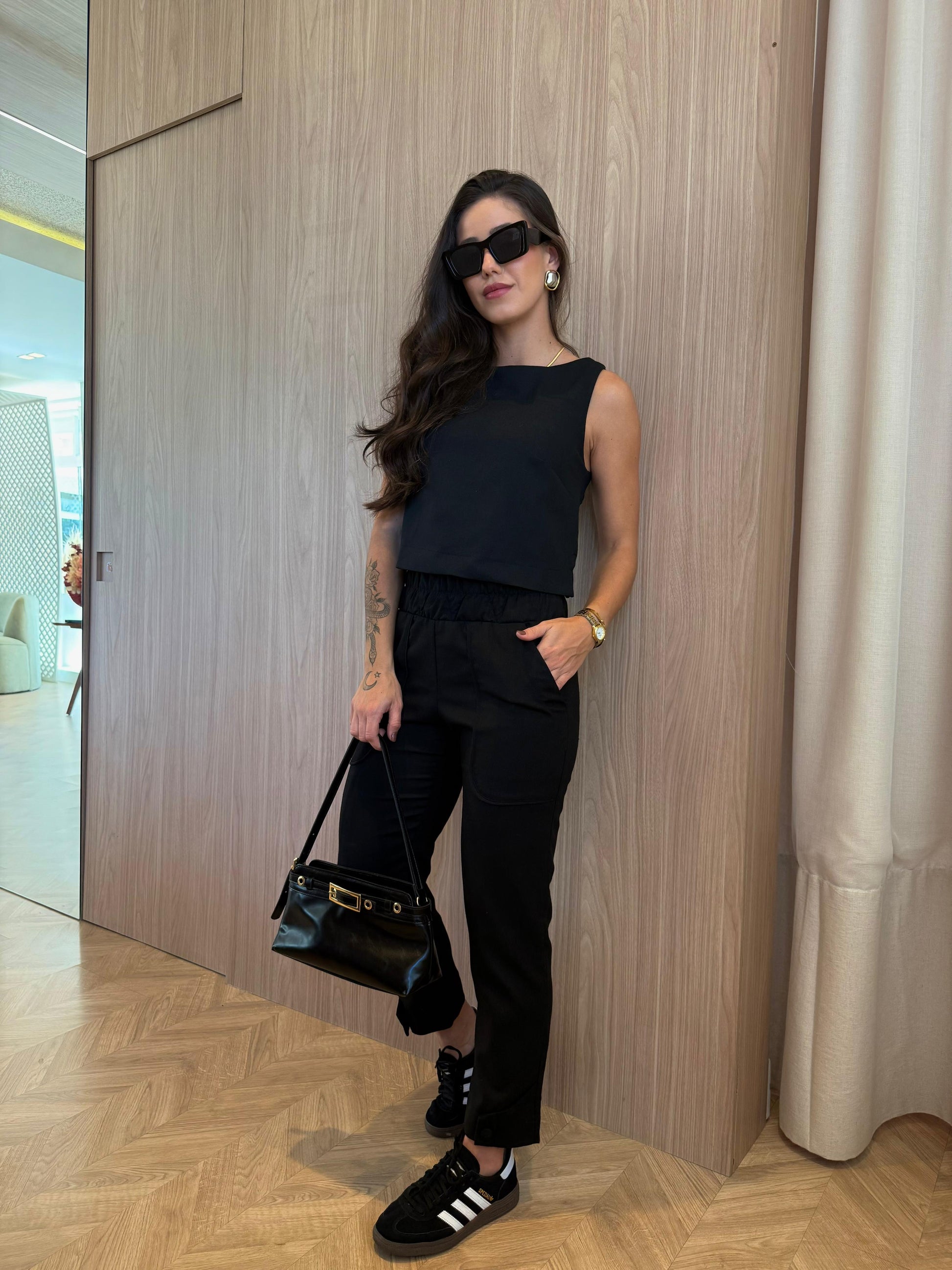 Calça cenoura com cós de elástico pespontado em zig zag;