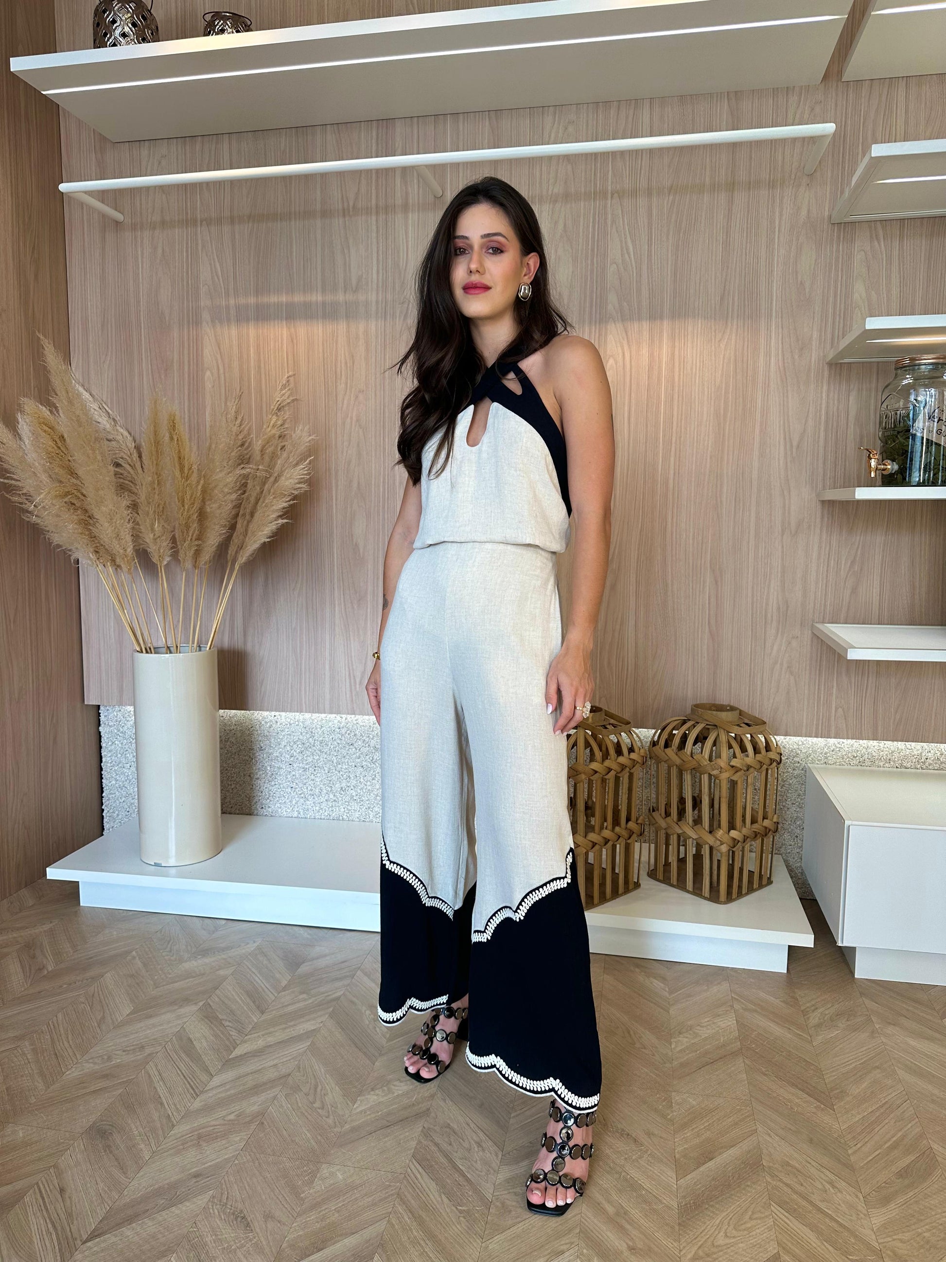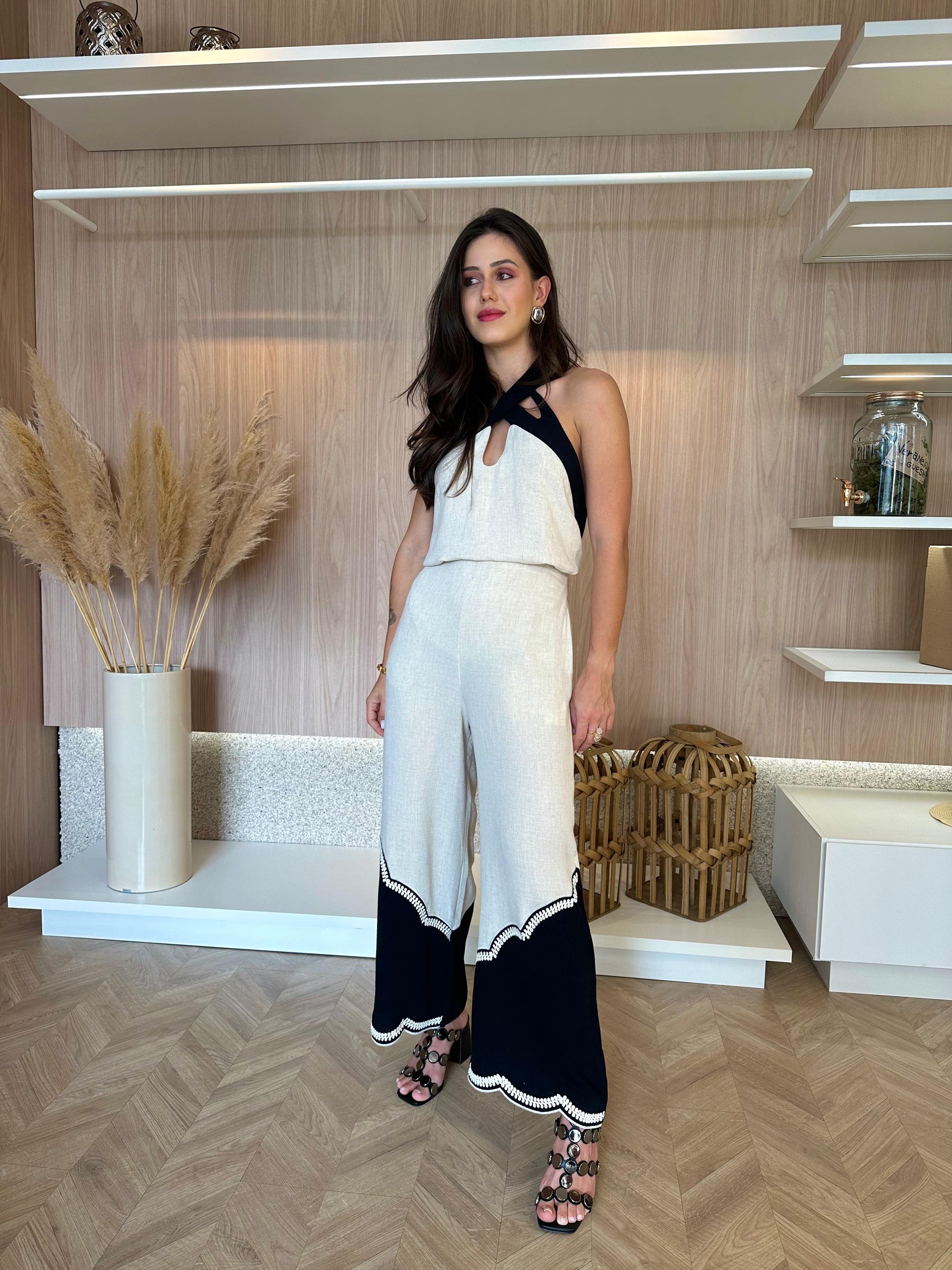 Confeccionada em tecido de viscose com linho para proporcionar conforto e elegância. Com uma modelagem pantalona, esta calça oferece um caimento impecável e fluido. Os bolsos laterais e traseiros adicionam funcionalidade, enquanto o elástico no cós das costas garante um ajuste perfeito. O destaque fica por conta do toque bicolor adornado com bordados que contornam a divisória das cores, conferindo um visual exclusivo e sofisticado. A Calça Eva é ideal para quem busca estilo e conforto em uma única peça.