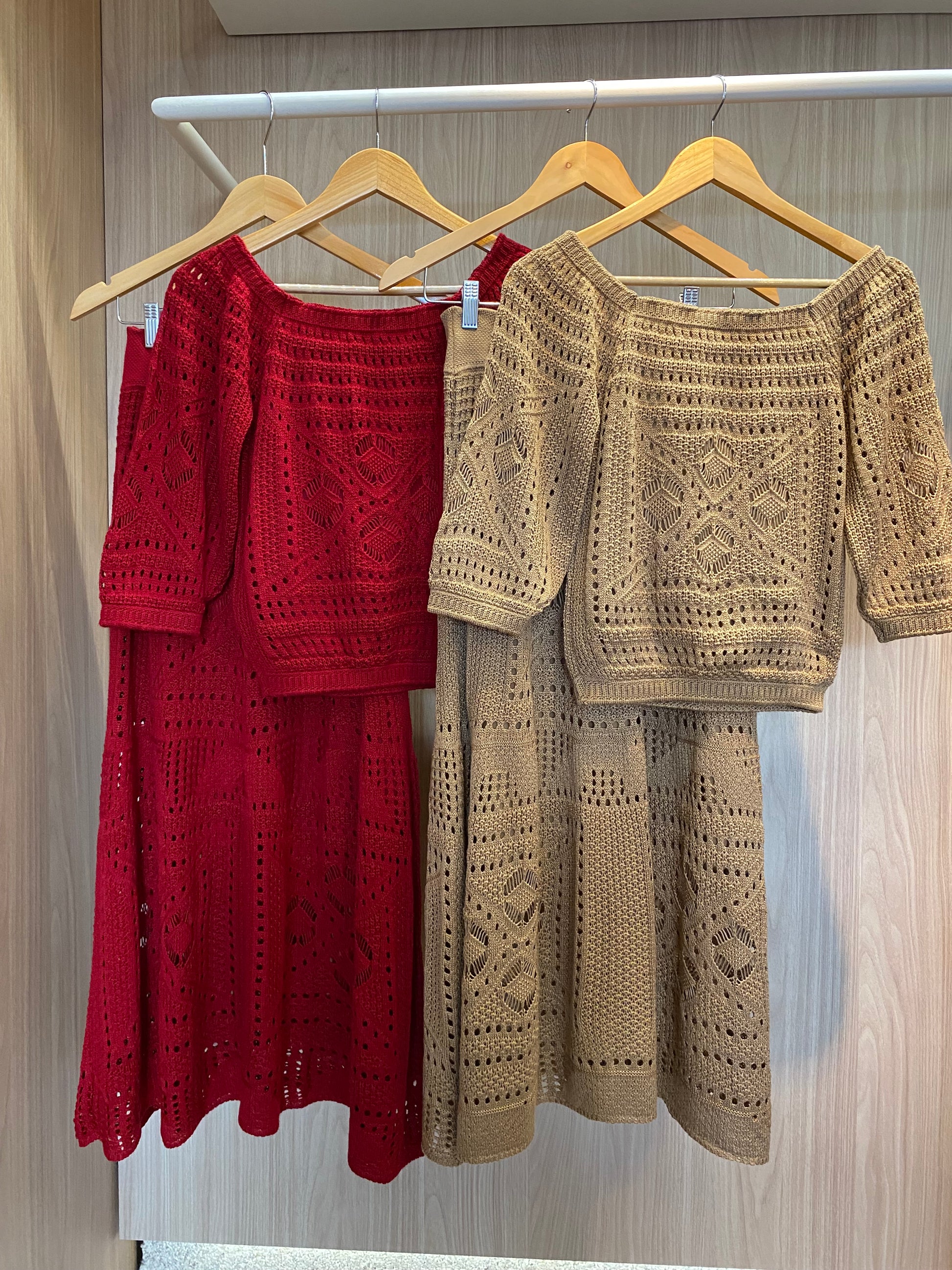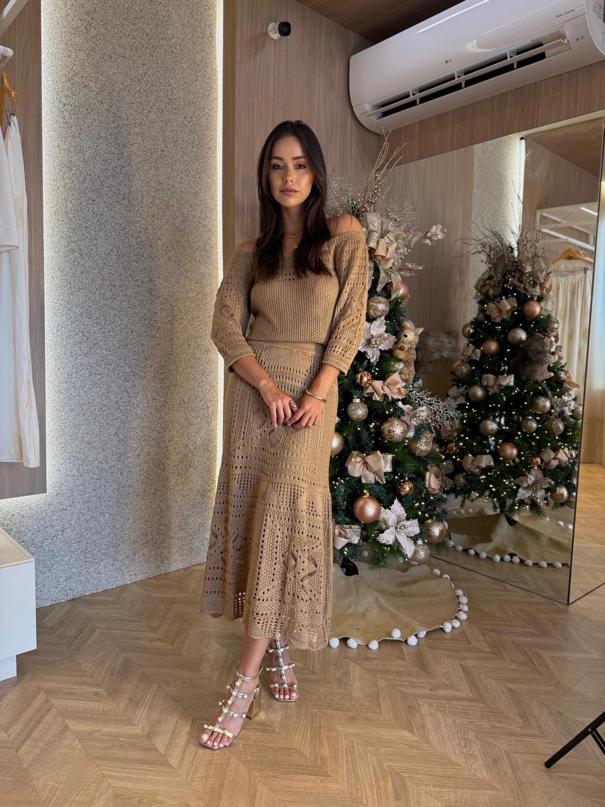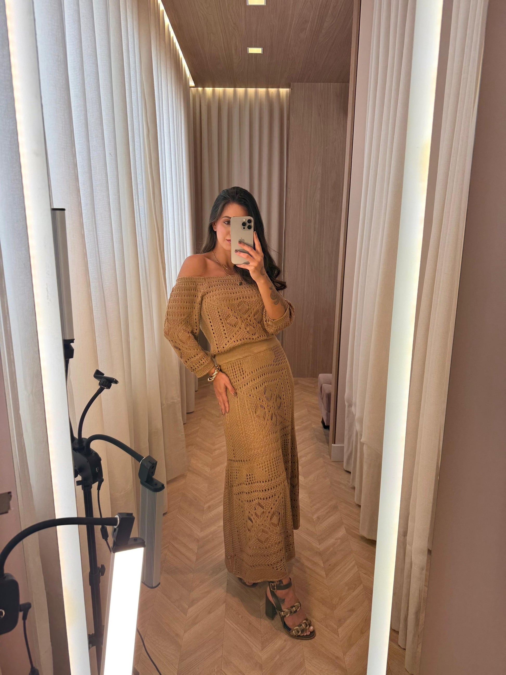 Conjunto composto por saia midi e blusa ombro a ombro