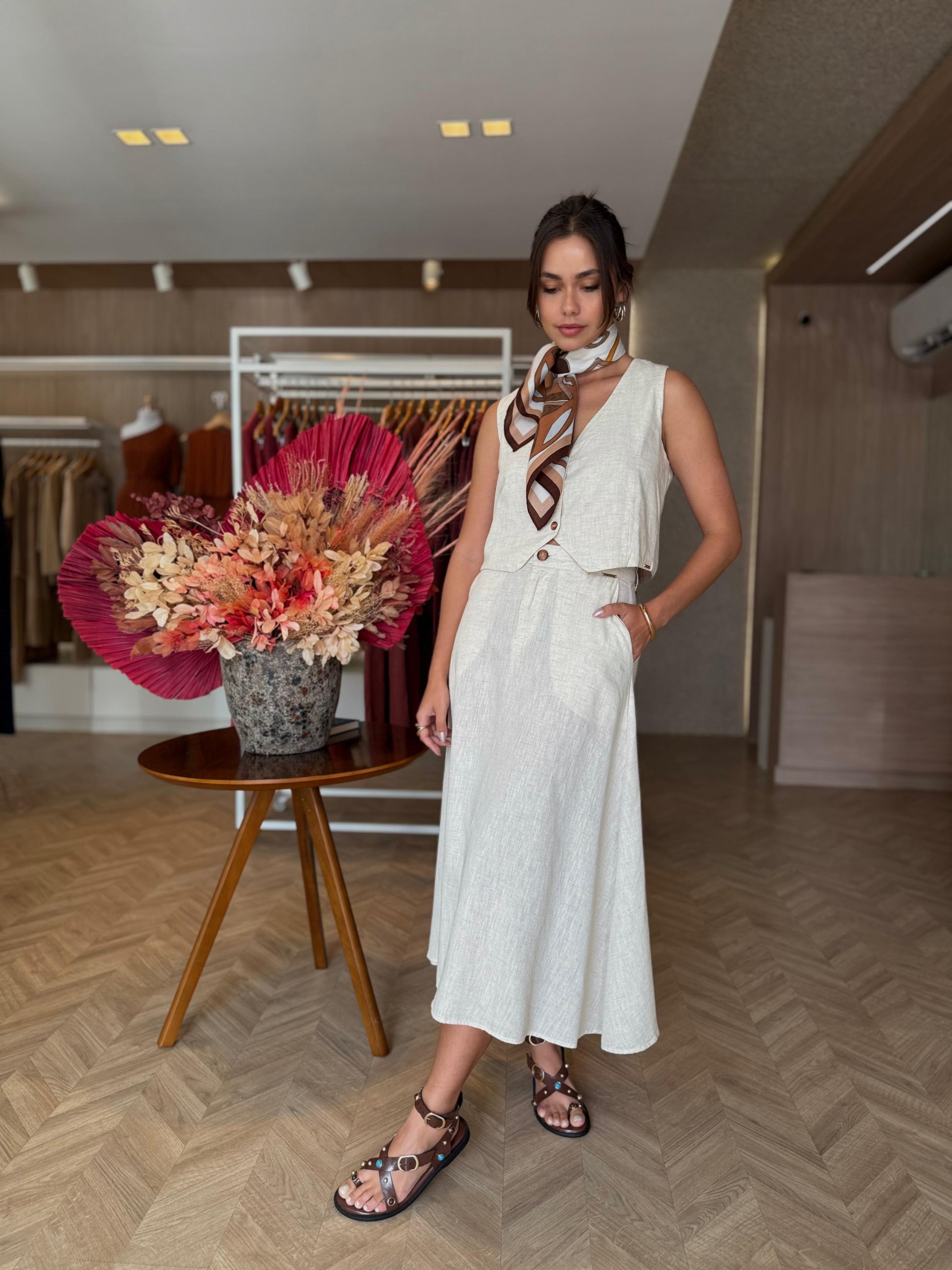 Fechamento frontal por zíper invisível e botão da mesma cor do tecido;
