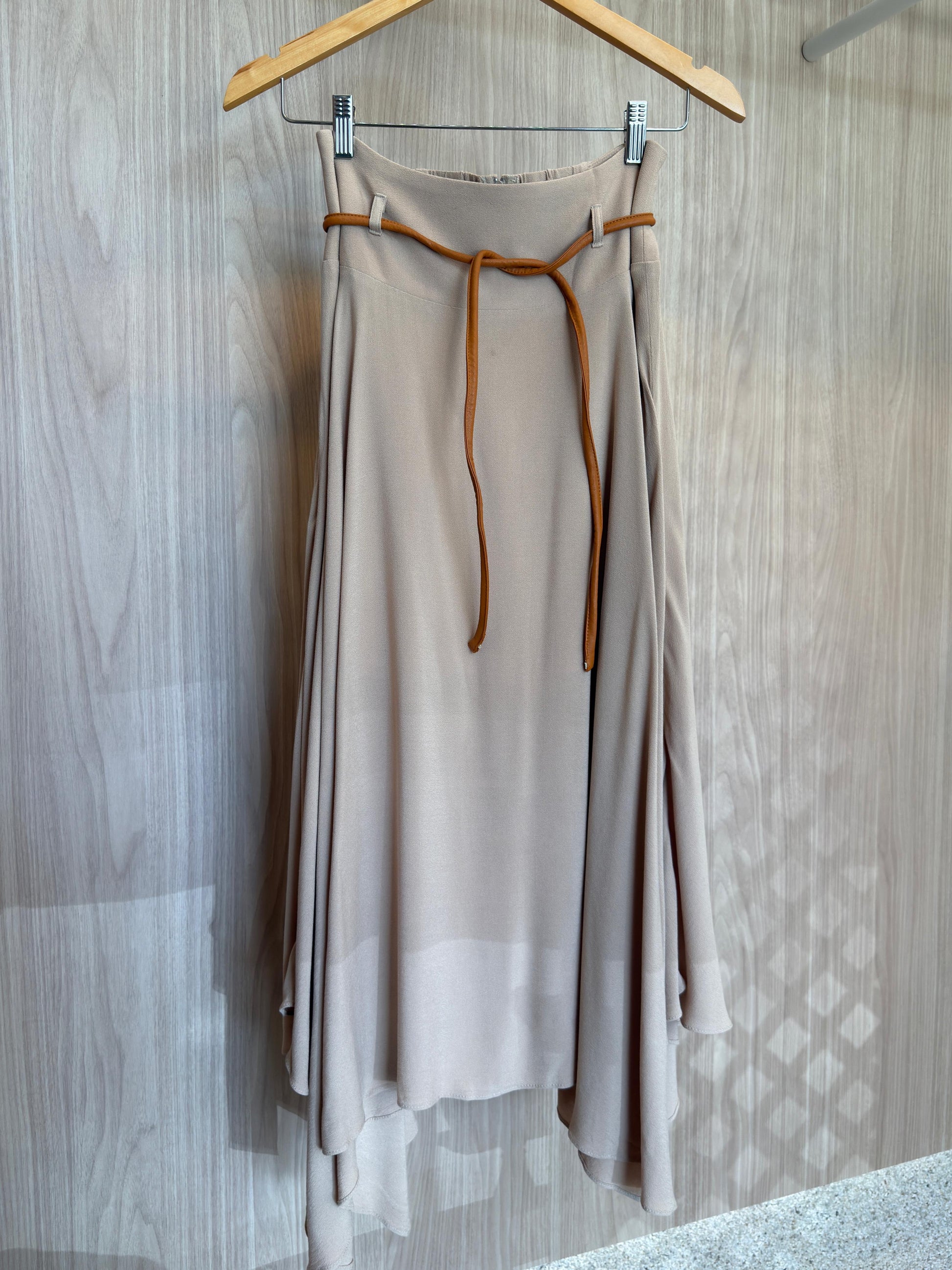 Saia Midi com cós largo e passantes flutuantes;
