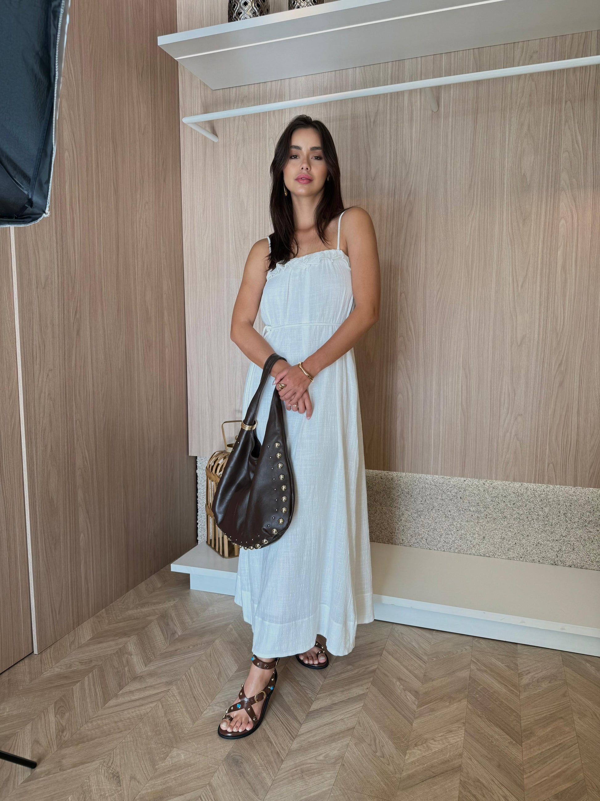 Vestido longo com detalhe de babado no busto;