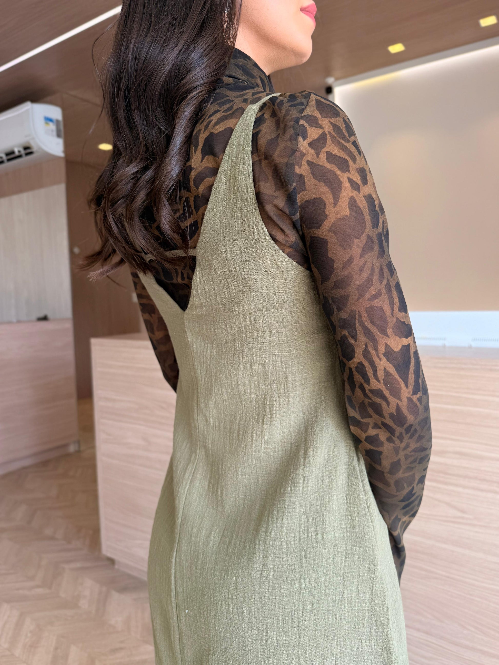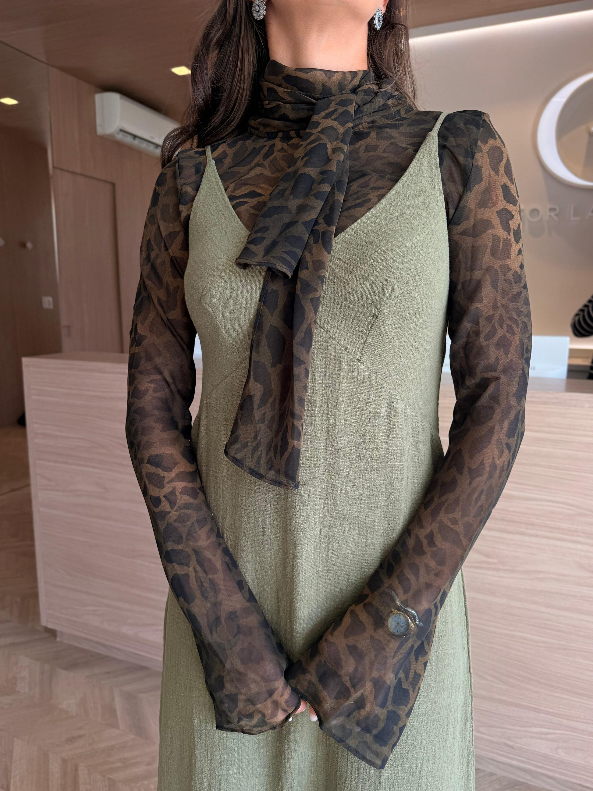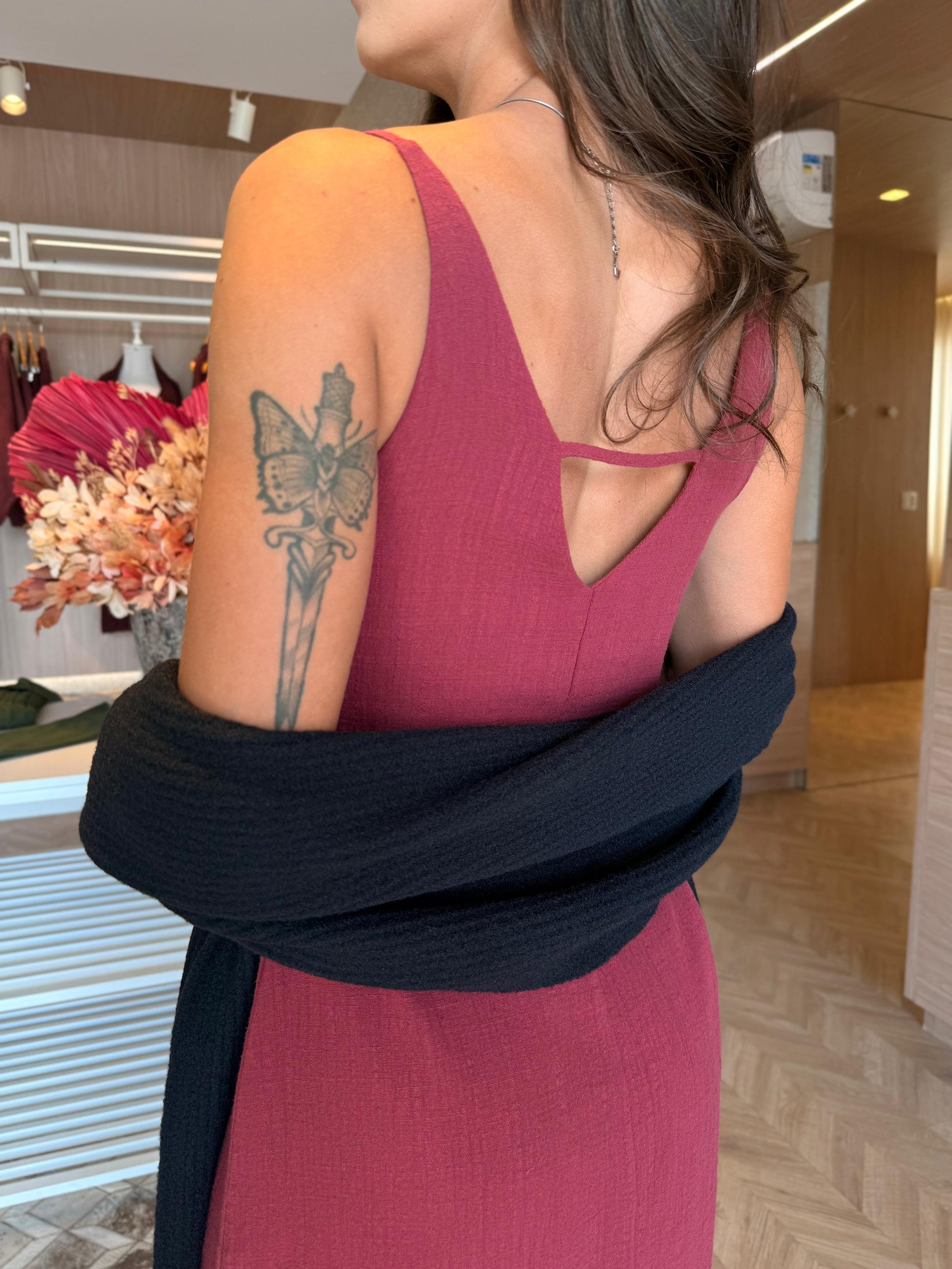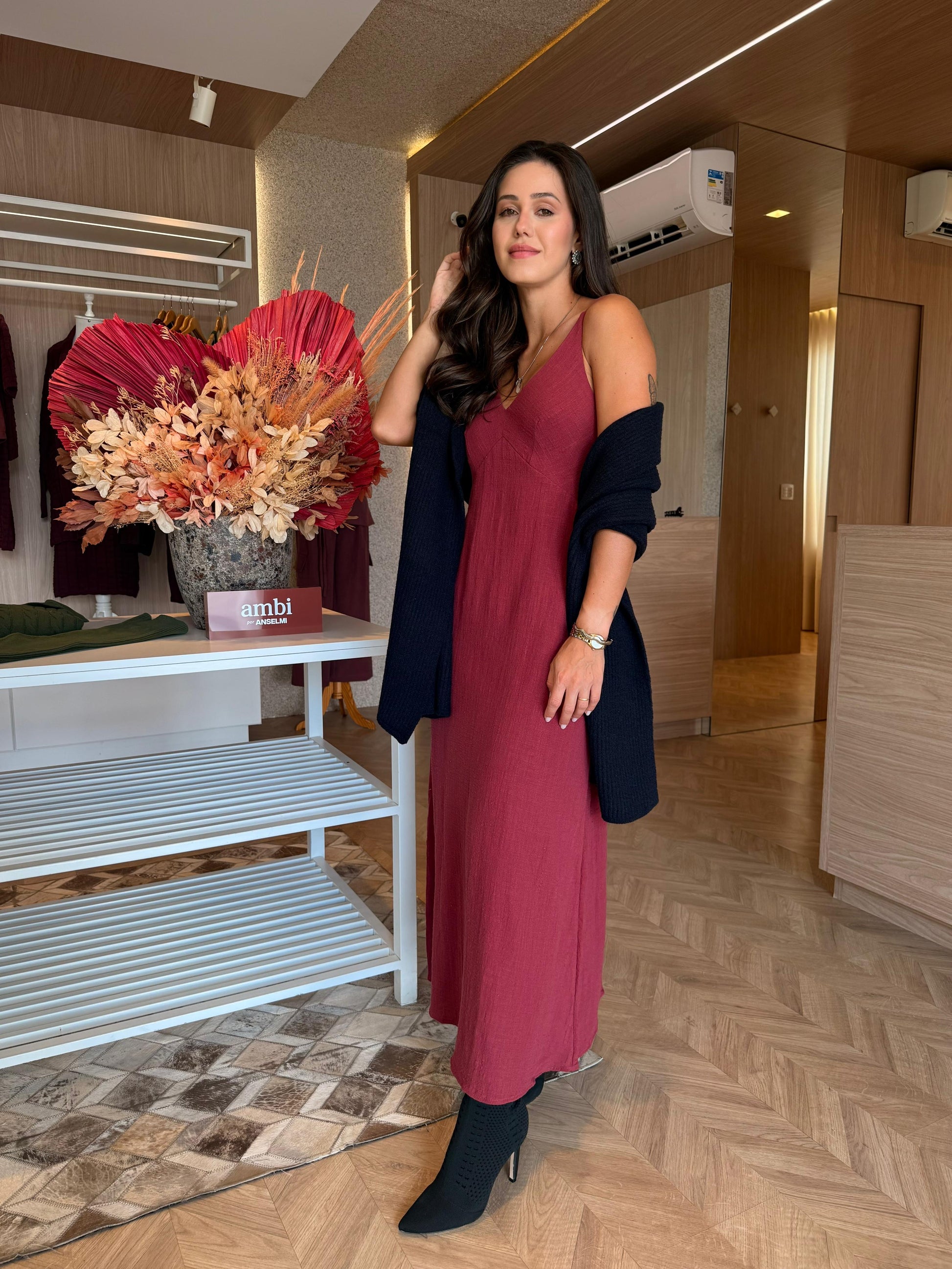 Acompanha cordão encapado do próprio tecido para amarração na cintura;