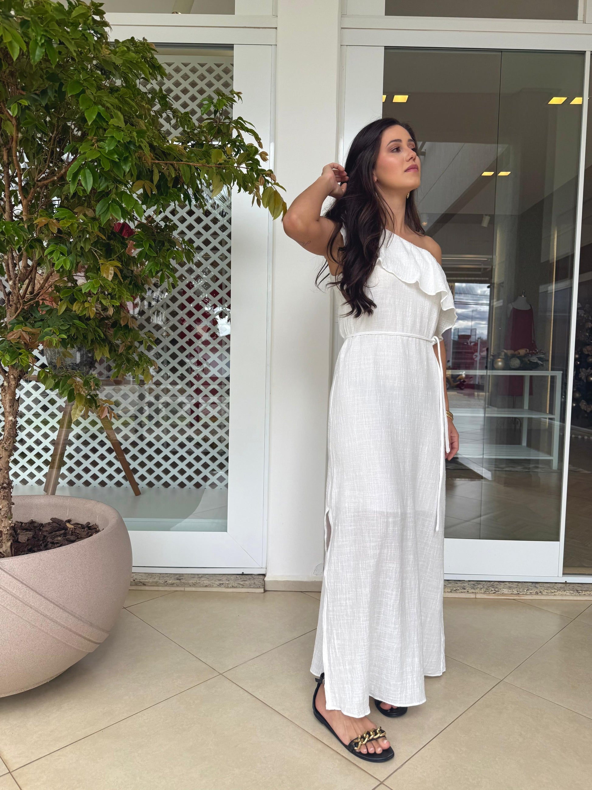 Vestido Midi de um ombro só com detalhe de pala babado;